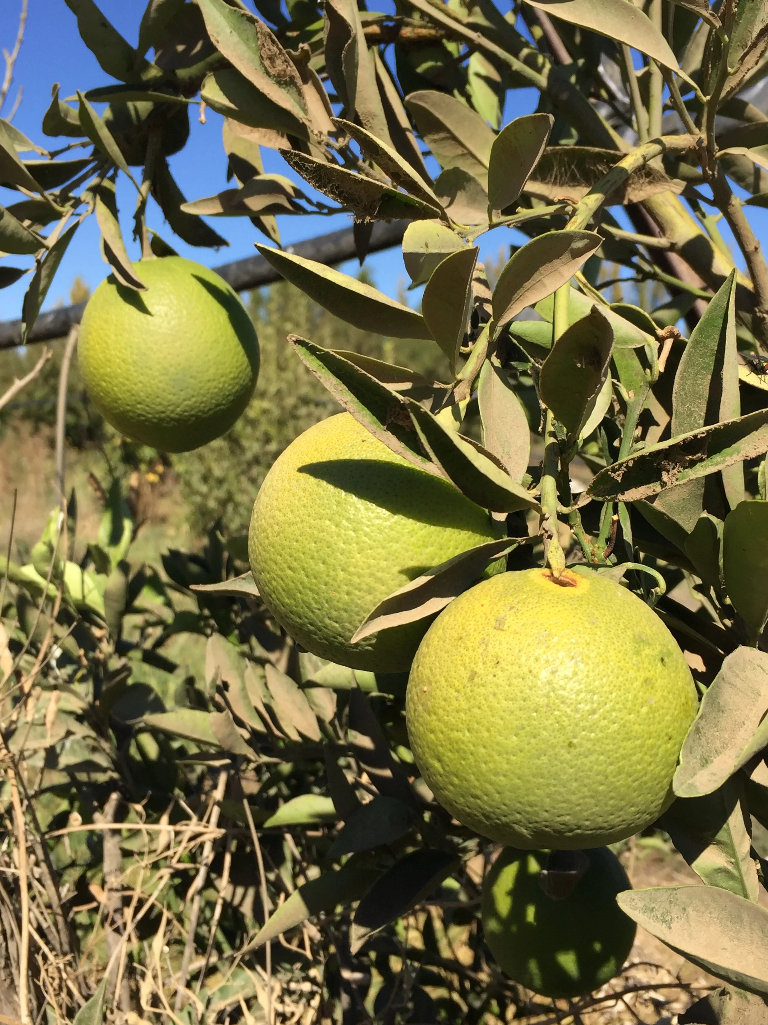 Most of the orchard is done working for the year. Pretty soon the leaves will fall and the stone fruit trees will take the winter off. The citrus trees are working hard, already loaded with green fruit. They are a promise of edible sweet sunshine for our winter shares. It is always tricky, because we never know if this winter will bring cold weather and a hard frost. A few years back, we had a hard frost that lasted a couple of weeks. Nigel ran the misters on the citrus trees to protect them from the severe cold. The ice actually acts as a barrier from the real cold. It was beautiful, rows of ice sculptures perfected by nature. It lasted far too long, though and we were very concerned we would lose our trees. Luckily, our orchard is quite healthy and strong. As you can see years later, there is fruit! Citrus is nature's way of sending us sunshine during the dark months of winter, really a pretty precious gift.