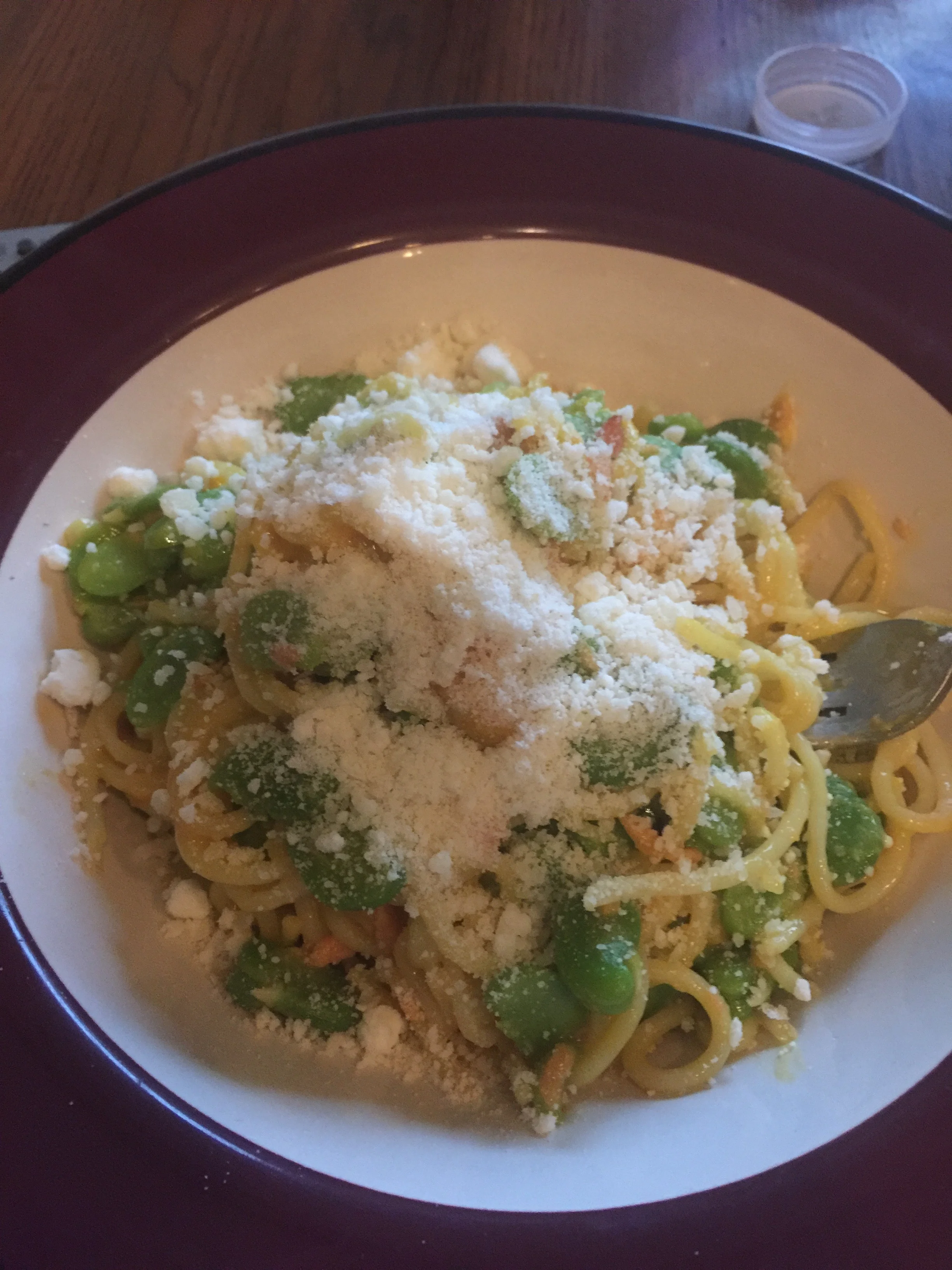 So what’s a girl to do while sitting and waiting? Read the NYT Cooking email of course. The article has a recipe for breakfast Shrimp and Grits, definitely one of my favorite meals, but I usually make it for dinner. They also had a recipe from Alton Brown for a Breakfast Carbonara, hmmmm, never thought about making Carbonara for breakfast, but what a great idea! I love pasta for breakfast, actually more for brunch. I made Nigel a Smoked Salmon, Goose Egg and Fava Bean Carbonara for dinner last night, he loved it. This too would make a great breakfast/brunch. We have goose eggs galore and I am trying to figure out how we can make them available to you guys. I think I have come up with a plan, so I am hoping Connie can get them on the list of add-on items for you all by the end of the week. The goose egg is really big, and the yolk is seriously rich, and it made a really great carbonara. So let’s hope it will work. If it does I will include my recipe in the Friday email.