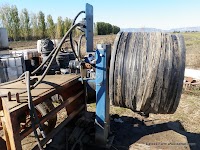 We use drip lines for many of our summer crops. It saves us water and most of the crops do not like water sprinkled on them. This is a machine that is hydraulically driven by the tractor. It winds the tape up onto a spool from the end of the field. We can then store the spool for use next year. So far we have been able to get two or three seasons use out of the drip line thus saving plastic.