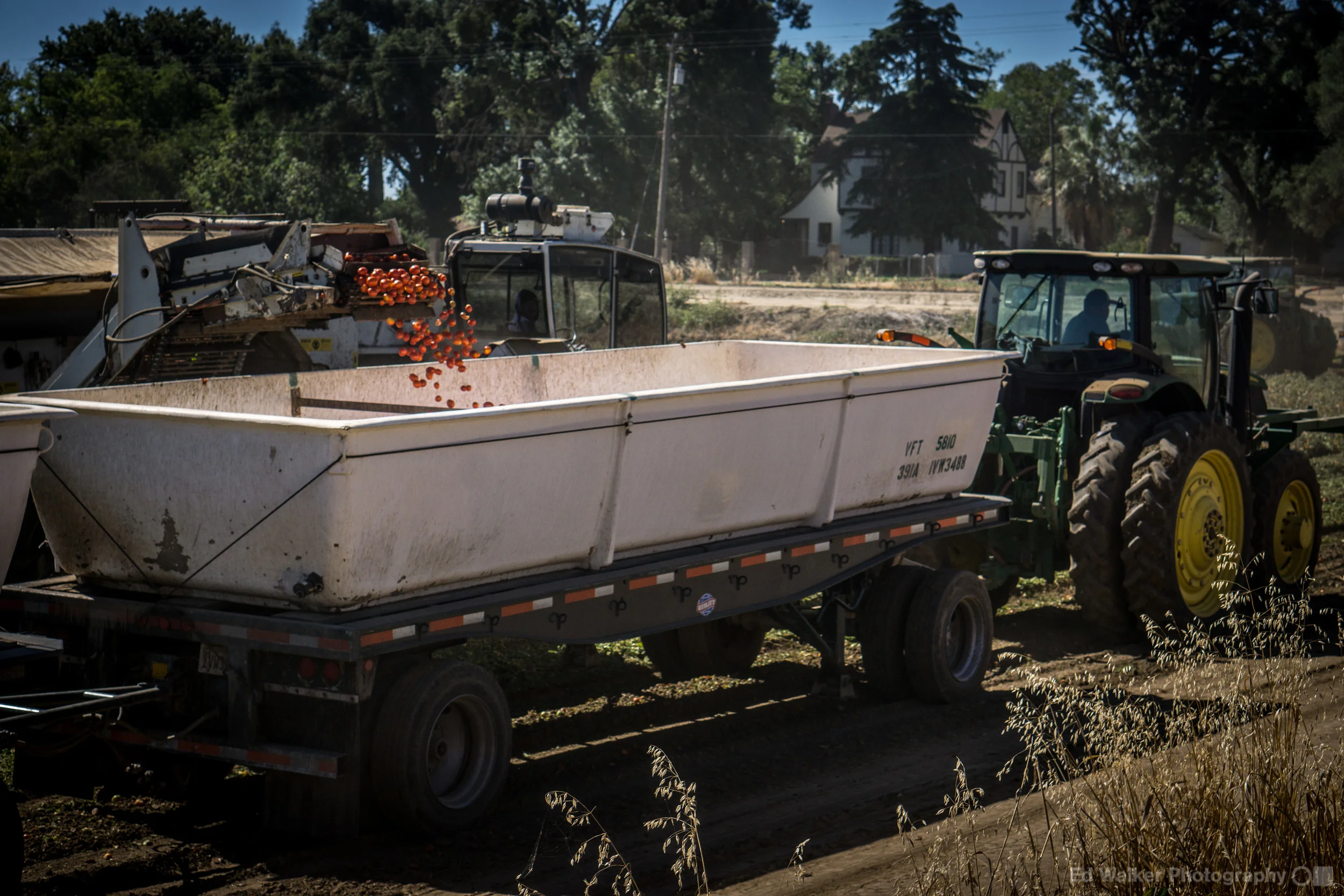 The most activity in the "hood" this time of year happens in the tomato fields. Right now we are smack in the thick of harvest. Campbell's has a plant here in Dixon that runs 3 to 4 months a year, simply making tomato soup. Trucks zoom up and down our road (far too fast, if you ask me!) 24 hours a day. The tomato harvesting also happens 24 hours a day. The soup factory is open for business and it, too, is running 24 hours a day. The harvesting rigs are enormous, operating at night using big lights. Literally, the plants are ripped out of the ground and sorted, the green tomatoes removed from the red ones, using sensors just before they go up the conveyor belt. As Nigel always tells people, these are not tomatoes you would want to eat, as they are grown for color and texture. The flavor happens when the soup blends are made. The blends are flavored differently depending on what part of the world the soup is going to.