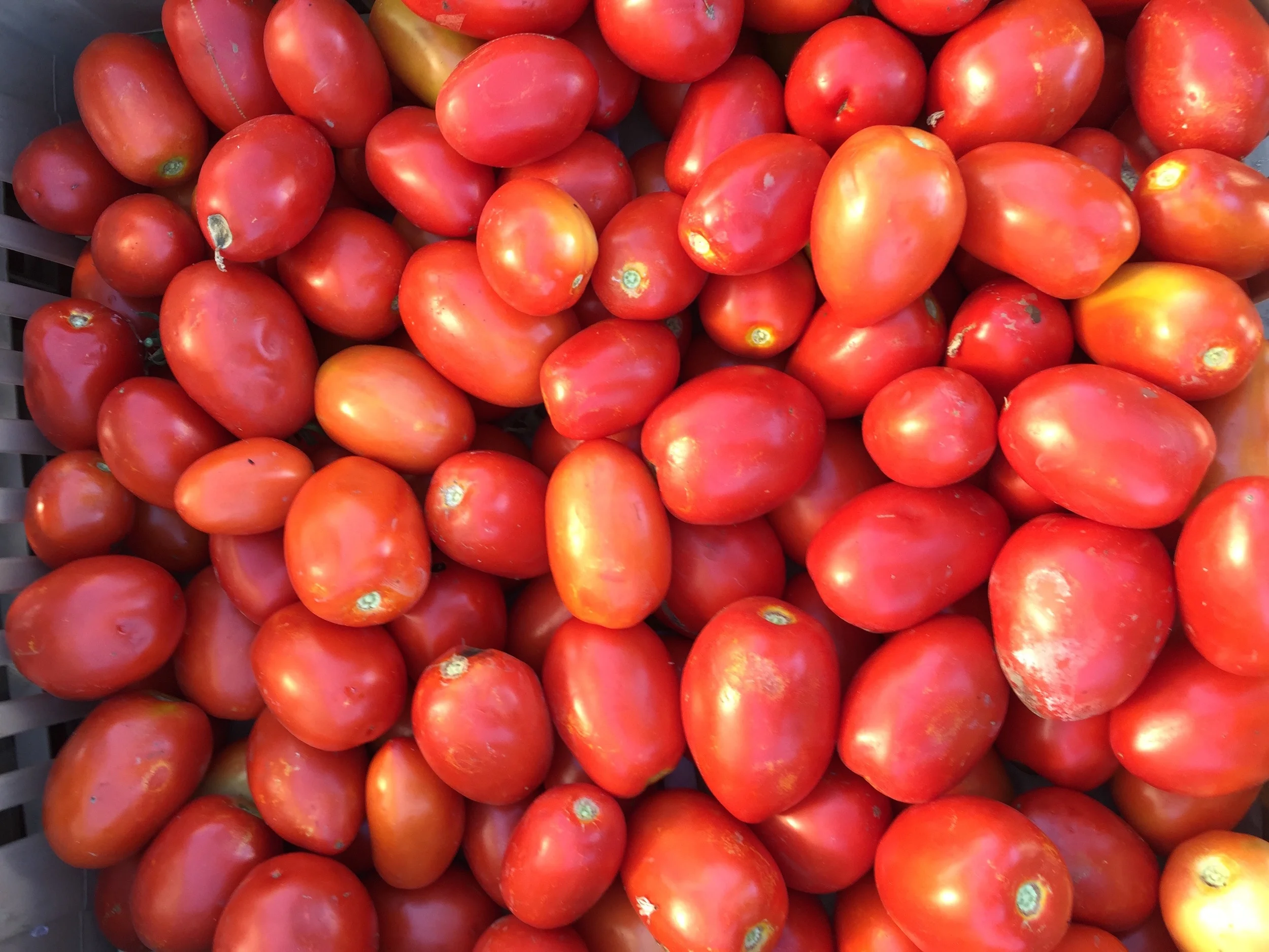 Hard to not be impressed with boxes like these! Nigel was the famous Tomato Wonderland farmer and we are certainly in the thick of it these days. I always ask that all the Roma tomatoes that do not sell at the market come back to the farm. I spend a couple of days, taking my time, roasting them in giant pans, draining off the extra liquid (which I reduce in a separate pot), quickly run them through the food mill, and then cook on low to thicken up my sauce. It's easy, it doesn't take much active time and works well with my schedule.