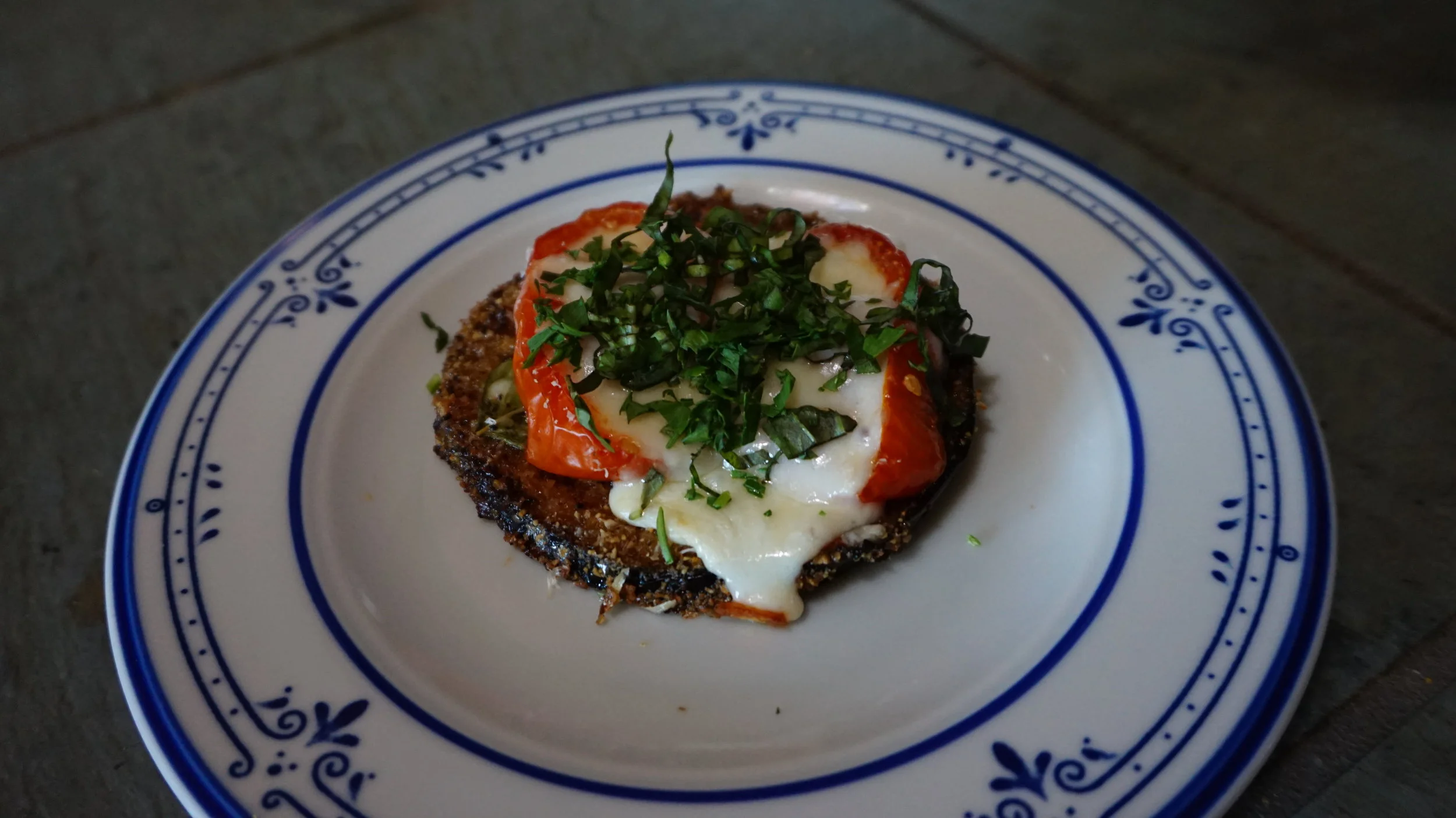 I pre-salt the eggplant slices and let them sit for at least 10 minutes to draw out some of the moisture. Then rinse and dry. Dip into the beaten egg, then into the almond meal. Fry on medium heat until a dark golden then carefully flip to the other side and fry until done. Put finished eggplant slices on a cooling rack with a tray underneath to catch oil drips.